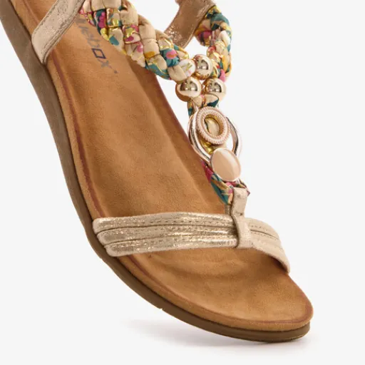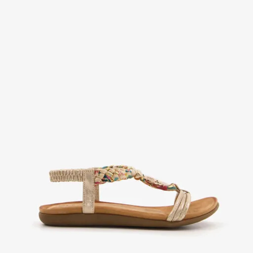Goudkleurige sandalen voor dames van Blue Box. Met een boven- en binnenwerk van imitatieleer en een rubberen zool. De sandalen hebben een elastisch hielbandje en meerdere bandjes over de wreef en tenen die afgewerkt zijn met gevlochten stof. Het comfortabele voetbed is gemaakt van textiel en voelt zacht aan.