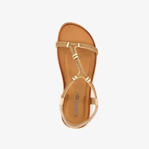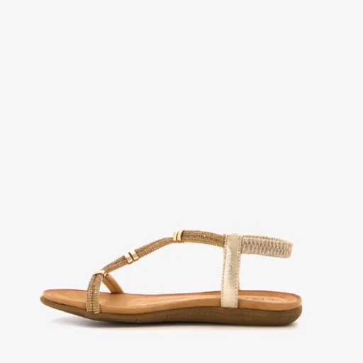 Goudkleurige sandalen voor dames van Blue Box. Met een boven- en binnenwerk van imitatieleer en een rubberen zool. De sandalen hebben een elastisch hielbandje en glittersteentjes op het bovenwerk. Het zachte, comfortabele voetbed is gemaakt van textiel.