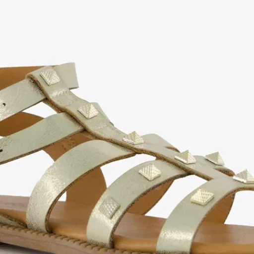 Goudkleurige sandalen voor dames van Blue Box. Met een boven- en binnenwerk van imitatieleer en een rubberen buitenzool. Voorzien van meerdere bandjes over de wreef en een enkelbandje met gespsluiting. Deze stoere damessandalen hebben studs op het bovenwerk. Het voetbed is gemaakt van synthetisch materiaal en is niet uitneembaar.
