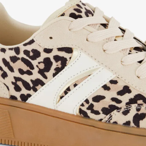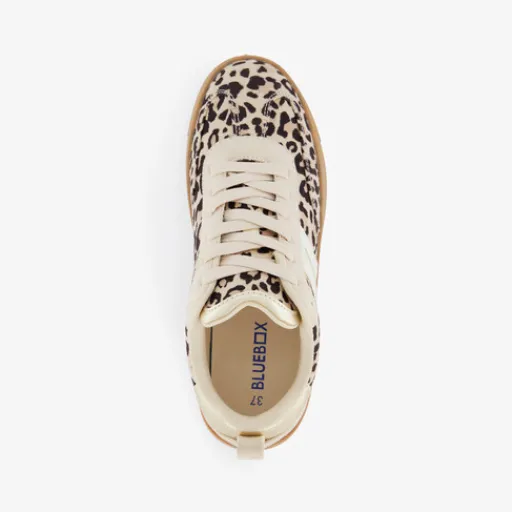 Lage, beige sneakers voor dames van Blue Box. Gemaakt van imitatieleer, een binnenwerk van textiel en een rubberen zool. De sneakers hebben een vetersluiting en comfortabel voetbed van imitatieleer. Deze is uitneembaar. De sneakers hebben luipaardprint op het bovenwerk en een metallic detail op de hiel.