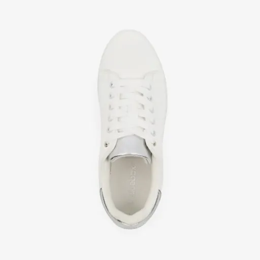 Witte sneakers voor dames van Blue Box. Gemaakt van imitatieleer, een binnenwerk van textiel en een rubberen zool. De sneakers hebben een vetersluiting en uitneembaar voetbed van textiel. Voorzien van metallic zilveren details op de hiel en tong.