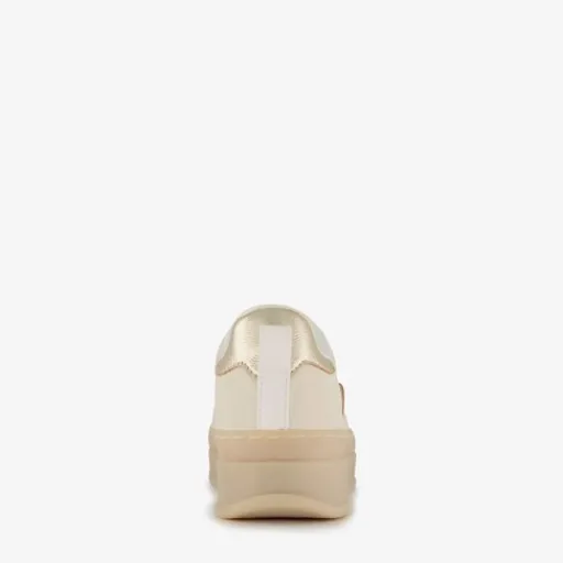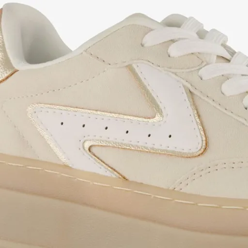 Beige sneakers met plateauzool voor dames. Gemaakt van imitatieleer, een binnenwerk van textiel en een rubberen zool. De sneakers hebben een vetersluiting en uitneembaar voetbed van textiel. Voorzien van metallic details in goud op het bovenwerk. De plateauzool is circa 3,5 cm hoog.
