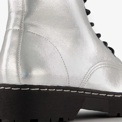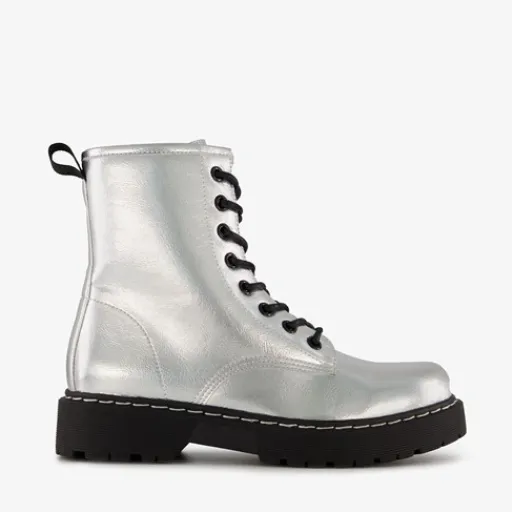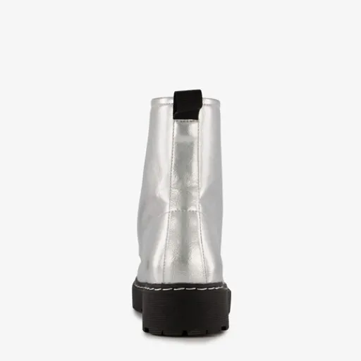 Zilverkleurige veterboots voor dames van Blue Box. Gemaakt van imitatieleer, een binnenwerk van textiel en een rubberen zool. De boots hebben een vetersluiting en aantreklusje op de hiel. Het vaste voetbed is gemaakt van imitatieleer. De veterboots hebben een schachthoogte van 15 cm en een lage hak van circa 2 cm.