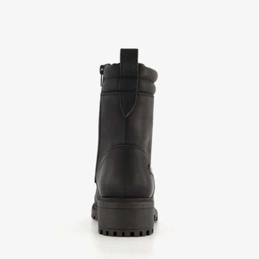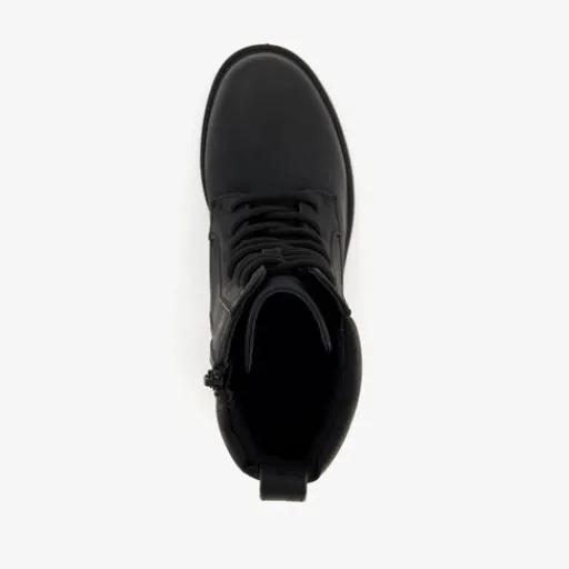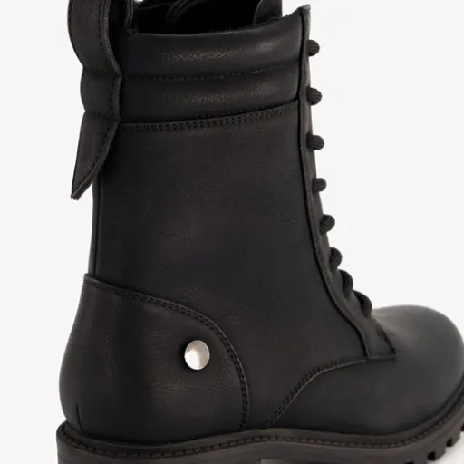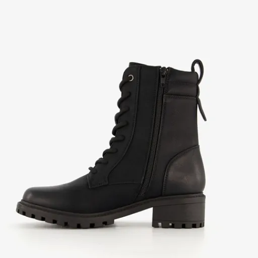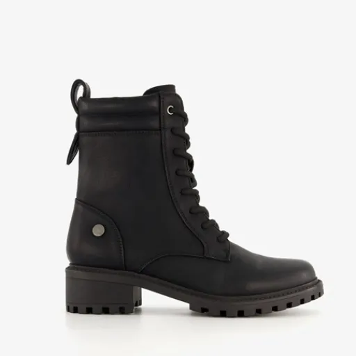 Zwarte veterboots voor dames. Gemaakt van imitatieleer, een binnenwerk van textiel en een rubberen zool. De boots hebben een vetersluiting en rits aan de binnenzijde. Het vaste voetbed is gemaakt van textiel. De veterboots hebben een schachthoogte van 16 cm en een lage hak van circa 2,5 cm.