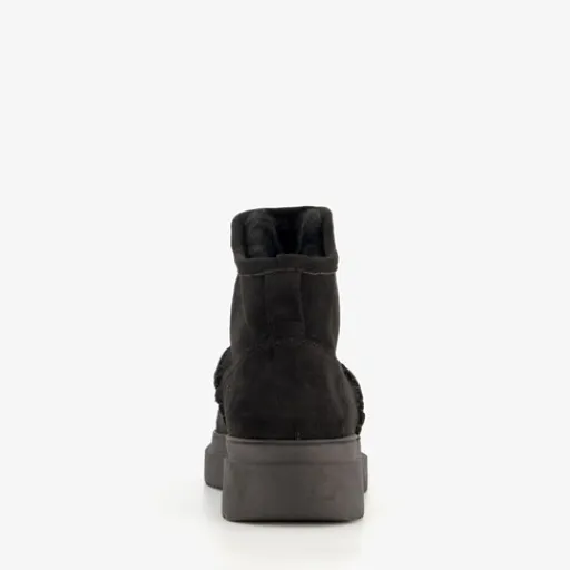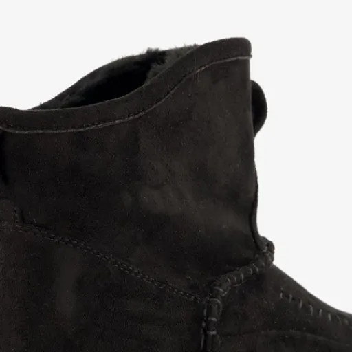 Lage, zwarte boots voor dames. Gemaakt van imitatiesuede, een binnenwerk van textiel en een rubberen zool. De boots hebben een elastische instap en aantreklusje aan de voorzijde voor een makkelijke instap. Het vaste voetbed is gemaakt van textiel. De lage boots hebben een warme voering van imitatiebont. Schachthoogte 10 cm.