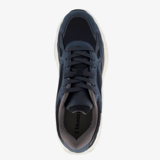 Donkerblauwe dad sneakers voor heren. Gemaakt van imitatieleer, een binnewerk van textiel en een rubberen zool. De sneakers hebben een vetersluiting en uitneembaar voetbed van textiel. Voorzien van zwarte details op het bovenwerk en een chunky zool.