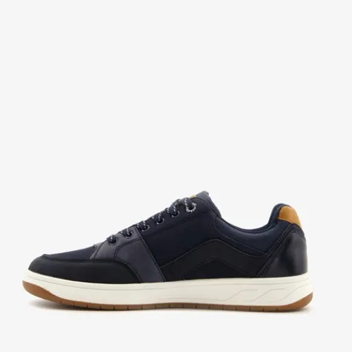 Blauwe heren sneakers van Blue Box. Gemaakt van imitatieleer met een binnenwerk van textiel en een stevige profielzool. Het comfortabele voetbed is gemaakt van leer, deze is niet uitneembaar. De sneakers hebben een bruin detail op de hak en op de tong. De stevige, witte zool met een beige onderzijde, zorgt voor grip en demping.