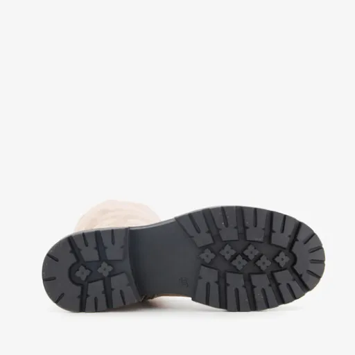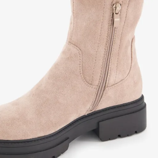 Hoge, beigeboots voor dames van Blue Box. Met een bovenwerk van imitatiesuede, een binnenwerk van textiel en een grove zool van rubber. De boots hebben een korte ritssluiting aan de binnenzijde en een vast voetbed van imitatieleer. De schachthoogte bedraagt 35 cm. De hoge boots hebben een dikke zool van circa 3 cm.