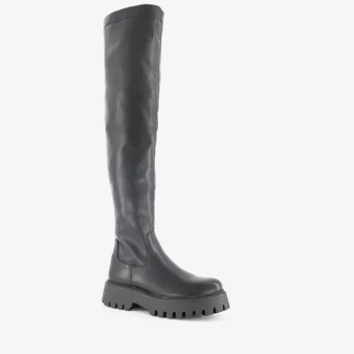 Hoge, zwarte boots voor dames van Blue Box. Gemaakt van imitatieleer, een binnenwerk van textiel en een rubberen zool. De hoge boots hebben een ritssluiting aan de binnenzijde en een vast voetbed van imitatieleer. Voorzien van een schachthoogte van 57 cm en een grove zool met een hoogte van circa 3 cm.