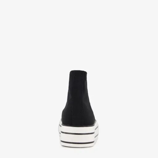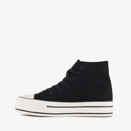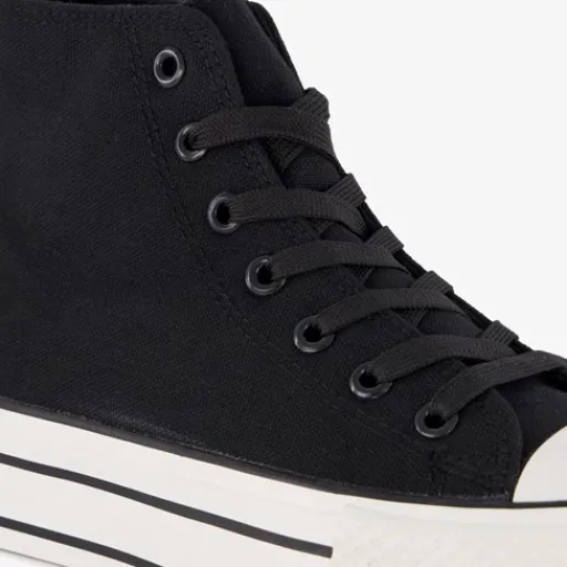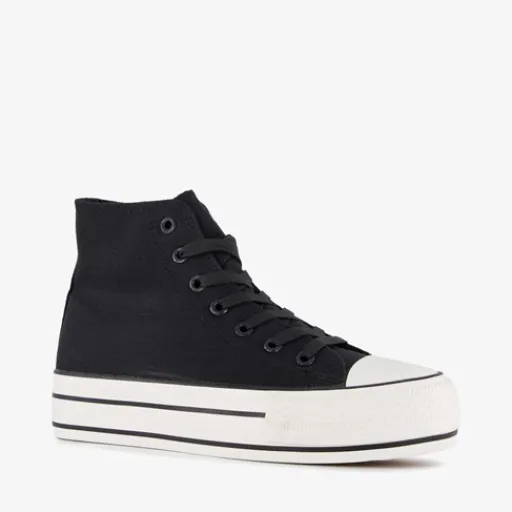 Hoge, zwarte gympen voor dames van Blue Box. Het buiten- en binnenwerk zijn gemaakt van textiel en de stevige zool met profiel is van rubber. De gympen hebben een vetersluiting en vast voetbed van textiel. Voorzien van een plateauzool met witte strepen. De plateauzool is 3.5 cm hoog en de schachthoogte is 10 cm.
