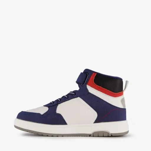 Hoge, blauwe sneakers voor jongens. Gemaakt van imitatieleer, een binnenwerk van textiel en een rubberen zool. De hoge sneakers hebben elastische veters met klittenbandsluiting voor een makkelijke instap. Het vaste voetbed is gemaakt van textiel. De sneakers hebben rode en witte accenten op het bovenwerk.