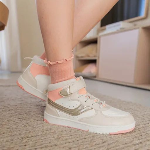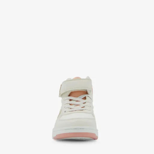 Hoge, beige meisjes sneakers uit de Blue Box collectie. Gemaakt van imitatieleer met een binnenwerk van textiel en een stevige profielzool van rubber. Voorzien van elastische veters, een klittenbandsluiting en hiellusjes voor een fijne pasvorm en een makkelijke instap. Deze mooie meisjes sneakers worden versierd met roze en metallic gouden details op het buitenwerk. Het comfortabele voetbed van textiel is niet uitneembaar.