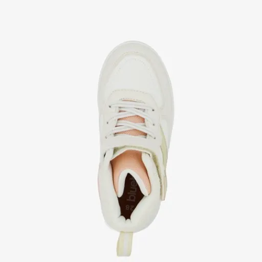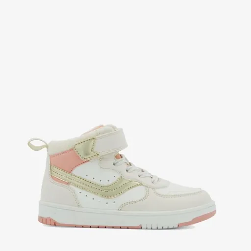 Hoge, beige meisjes sneakers uit de Blue Box collectie. Gemaakt van imitatieleer met een binnenwerk van textiel en een stevige profielzool van rubber. Voorzien van elastische veters, een klittenbandsluiting en hiellusjes voor een fijne pasvorm en een makkelijke instap. Deze mooie meisjes sneakers worden versierd met roze en metallic gouden details op het buitenwerk. Het comfortabele voetbed van textiel is uitneembaar.