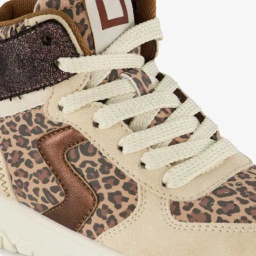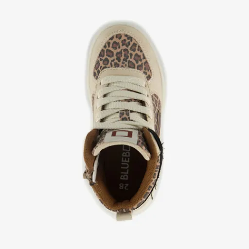 Hoge, beige sneakers voor meisjes van Blue Box. Het buitenwerk is gemaakt van imitatieleer, het binnenwerk van textiel, en de stevige zool met profiel is van rubber. De sneakers zijn voorzien van een veter- en ritssluiting voor een optimale pasvorm, en hebben een comfortabele binnenzool van textiel. Deze is uitneembaar, zodat je eventueel je eigen zolen in de schoenen kunt dragen. Op het bovenwerk van de sneakers zijn panterprint details en bruine glitters aangebracht.
