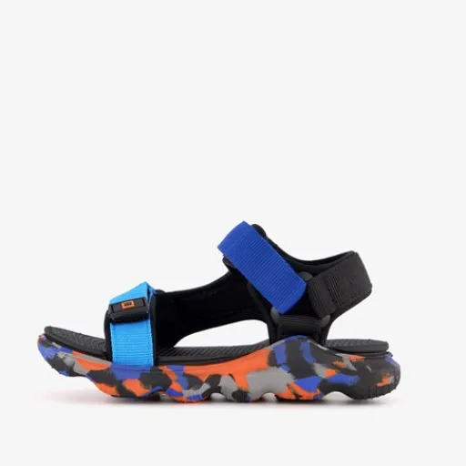 Blauwe Blue Box sandalen met oranje details voor jongens. Het boven- en binnenwerk zijn gemaakt van textiel en de stevige profielzool is van rubber. De sandalen hebben klittenbandsluitingen bij de tenen en de enkel voor een makkelijke instap.