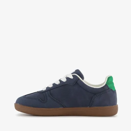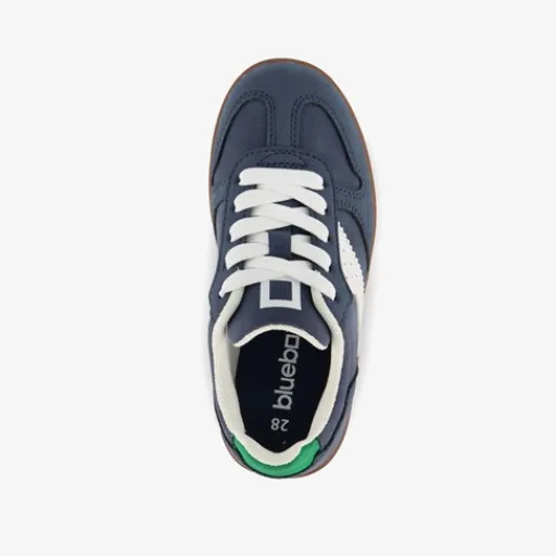 Blauwe Blue Box jongens sneakers. Gemaakt van imitatieleer met een binnenwerk van textiel en een stevige profielzool van rubber. Voorzien van een vetersluiting en een comfortabele binnenzool van textiel. Deze is niet uitneembaar. De sneakers hebben witte en groene details op het bovenwerk en een bruine buitenzool.