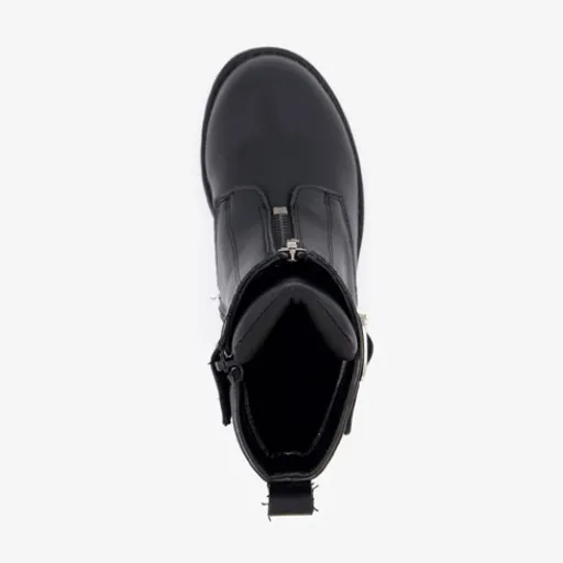 Zwarte boots voor meisjes uit de Blue Box collectie. Gemaakt van imitatieleer met een binnenwerk van textiel en een stevige zool van rubber. Voorzien van een rits aan de voorzijde en een rits met een klittenbandje aan de binnenzijde. De laarsjes hebben aantreklusjes aan de achterzijde en een gesp aan de buitenzijde. Binnenzool is uitneembaar. Schachthoogte is 13 cm.