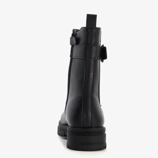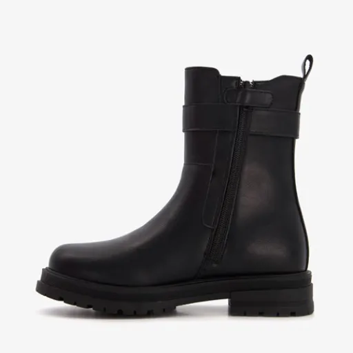 Zwarte Chelsea boots voor meisjes van Blue Box. Het buitenwerk is gemaakt van imitatieleer, het binnenwerk van textiel en de stevige zool met een laag hakje van rubber. Voorzien van een rits met een klittenbandje aan de binnenzijde en aantreklusjes aan de achterkant. De laarsjes hebben elastische inzetten aan de buitenzijde met een kleine, verstelbare gesp. Schachthoogte is 16 cm. Het comfortabele voetbed van textiel is uitneembaar zodat je eventueel jouw eigen zolen in de schoenen kan dragen.