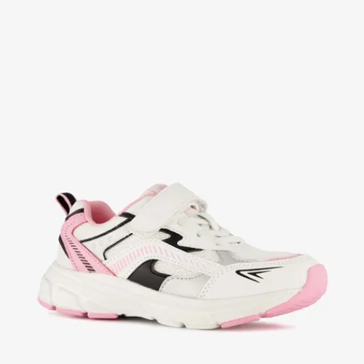 Witte dad sneakers voor meisjes, met roze en zwarte details. Gemaakt van imitatieleer, een binnenwerk van textiel en een rubberen zool. De sneakers hebben elastische veters met klittenbandsluiting voor een makkelijke instap. Het vaste voetbed is gemaakt van textiel. De dad sneakers hebben een grove, chunky zool van rubber.
