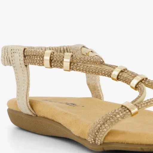 Goudkleurige meisjes sandalen van Blue Box. Gemaakt van imitatieleer met een stevige profielzool van rubber. Voorzien van elastische bandjes bij de enkels voor een makkelijke instap. Deze leuke meisjes sandalen worden versierd met goudkleurige strass steentjes en ringen om de banden heen.