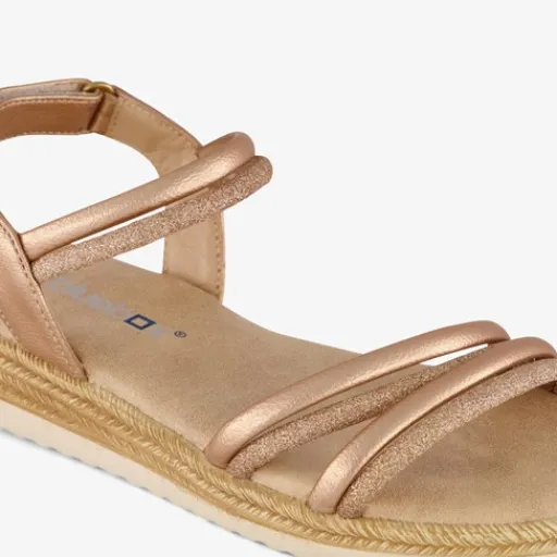 Rose gouden sandalen met glitters en een jutte sleehakje voor meisjes. De sandalen zijn gemaakt van imitatieleer en hebben een stevige profielzool van rubber. Voorzien van bandjes bij de tenen en bij de enkel en een klittenbandsluiting bij de hak. Binnenzool is niet uitneembaar.