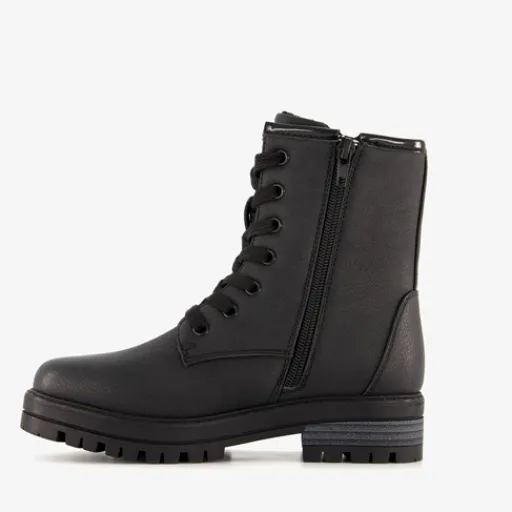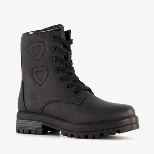 Zwarte veterboots voor meisjes van Blue Box. Met een boven- en binnenwerk van imitatieleer en een rubberen zool. De boots hebben een vetersluiting en rits aan de binnenzijde. Het comfortabele voetbed is gemaakt van textiel. Deze is niet uitneembaar. Voorzien van hartjes aan de bovenzijde en een schachthoogte van 14 cm.