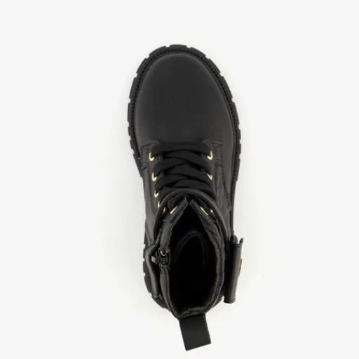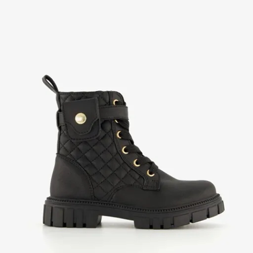 Zwarte veterboots voor meisjes van Blue Box. Gemaakt van imitatieleer, een binnenwerk van textiel en een rubberen zool. De boots hebben een vetersluiting en rits aan de binnenzijde. Het vaste voetbed is gemaakt van imitatieleer. Voorzien van een klein vakje met drukknoop en een schachthoogte van 12 cm.