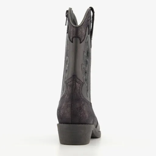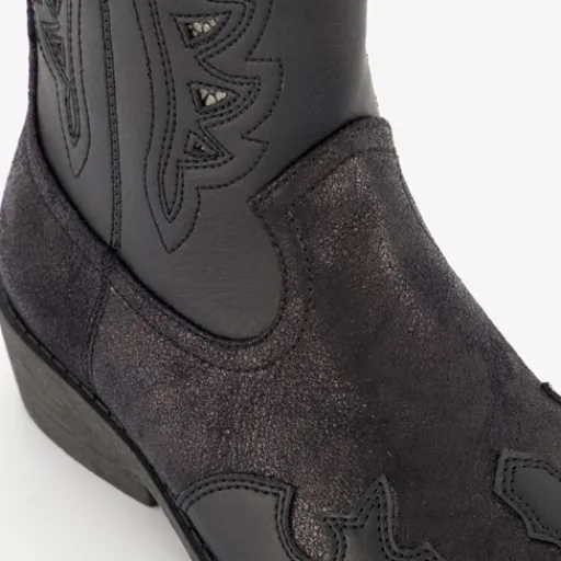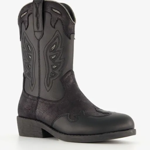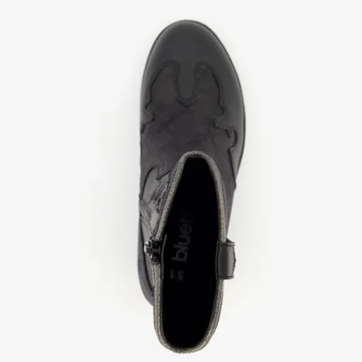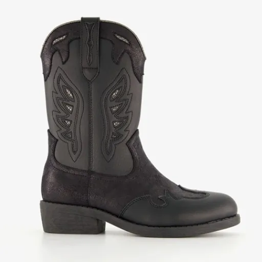 Zwarte western laarsjes van Blue Box. Deze halfhoge laarsjes hebben een buitenwerk van imitatieleer, een binnenwerk van textiel en een stevige zool met een laag hakje. Deze stijlvolle boots zijn voorzien van verschillende details op het buitenwerk en een rits aan de binnenzijde. Bovenaan de schacht voorzien van een aantreklusje. De schachthoogte is circa 16 cm.