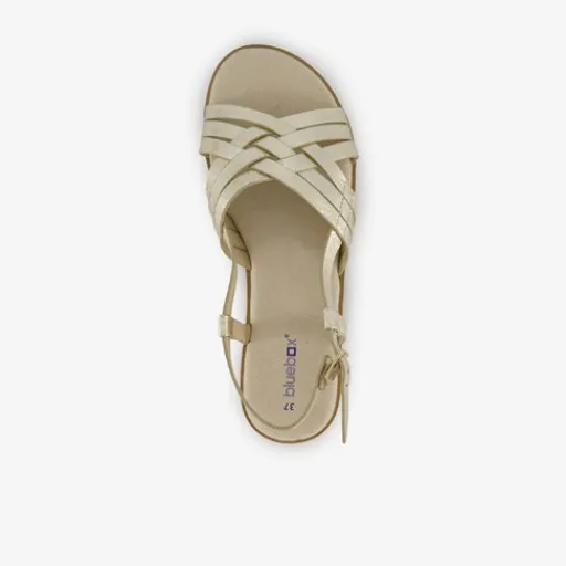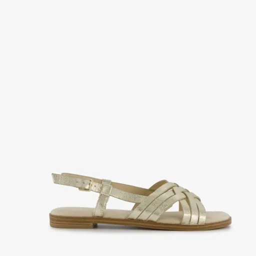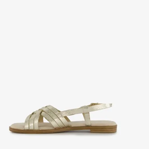 Goudkleurige sandalen voor dames van Blue Box. Met een boven- en binnenwerk van imitatieleer en een rubberen zool. De sandalen hebben een hielbandje met gespsluiting en een comfortabel voetbed van textiel. Voorzien van metallic op het bovenwerk.