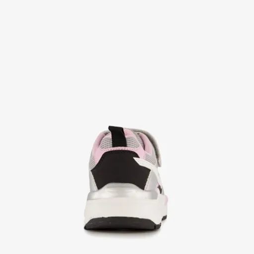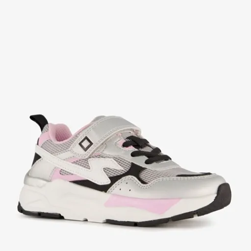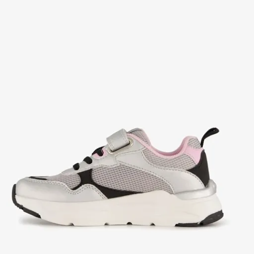 Zilverkleurige metallic sneakers voor meisjes met roze details. Gemaakt van imitatieleer, een binnenwerk van textiel en een rubberen zool met zwarte onderzijde. Voorzien van drie klittenbandsluitingen voor een makkelijke instap en optimale pasvorm. Het vaste voetbed is gemaakt van textiel. De sneakers hebben roze details op het buitenwerk.
