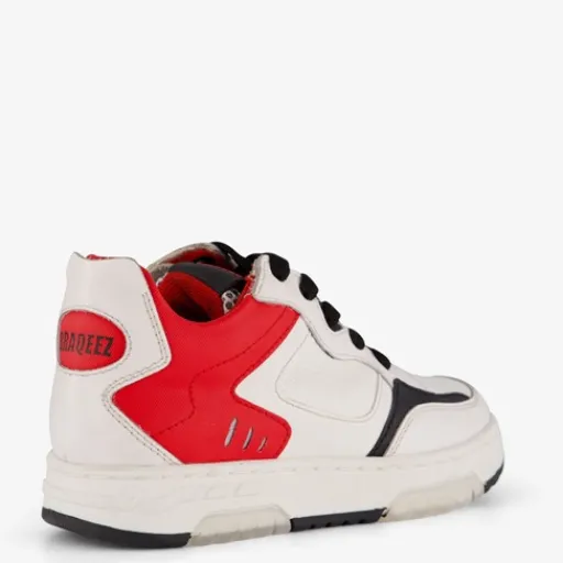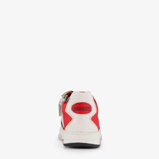 Witte jongens sneakers met rode en zwarte accenten van Braqeez. Het buitenwerk is gemaakt van leer, het binnenwerk van textiel en de stevige buitenzool met profiel van rubber. Voorzien van een klittenbandsluiting en een comfortabele binnenzool van leer. Deze is niet uitneembaar.