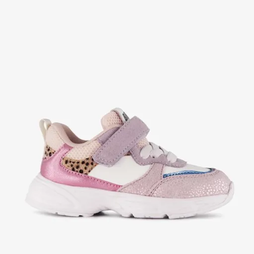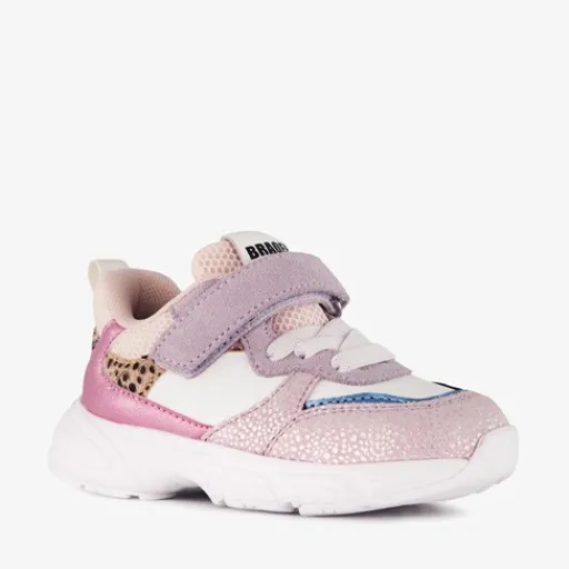 Pastel meisjes sneakers van Braqeez. Gemaakt van leer, een binnenwerk van imitatieleer en een rubberen zool. De sneakers hebben elastische veters met klittenbandsluiting voor een makkelijke instap. Het voetbed is uitneembaar en gemaakt van leer. Voorzien van roze details en dierenprint op het bovenwerk.