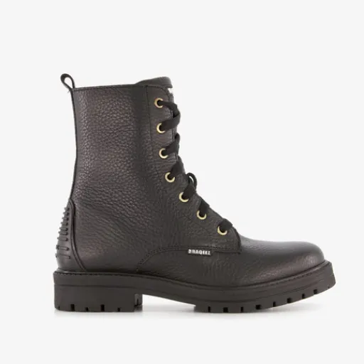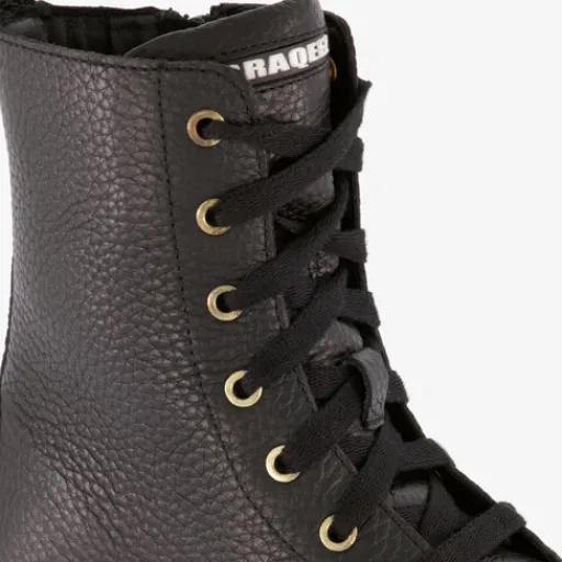 Zwarte veterboots voor meisjes van Braqeez. Het buitenwerk is gemaakt van leer, het binnenwerk van imitatieleer en de stevige zool met profiel is van rubber. De boots hebben een vetersluiting en een ritssluiting aan de binnenzijde voor een optimale pasvorm en een aantreklusje aan de achterzijde voor een makkelijke instap. Ze zijn voorzien van een comfortabele, uitneembare binnenzool van leer en hebben een schachthoogte van 14 cm.