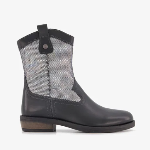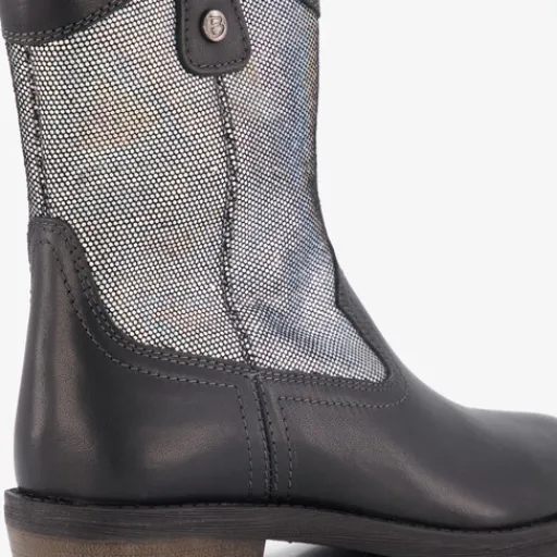 Zwarte western boots voor meisjes van Braqeez. Het buitenwerk is van leer gemaakt, het binnenwerk van imitatieleer en de stevige buitenzool met een laag hakje is van rubber. Voorzien van een ritssluiting met een klittenbandje aan de buitenzijde en aantreklusje aan de bovenzijde. De laarsjes hebben een comfortabele binnenzool van leer en zilverkleurige stippen op de schacht. Schachthoogte is 15 cm. Binnenzool is uitneembaar.