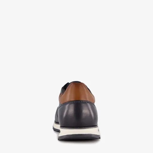 Lage, donkerblauwe sneakers voor heren uit de Bugatti collectie. Gemaakt van leer, een binnenwerk van polyester en een rubberen zool. De sneakers hebben een vetersluiting en comfortabel voetbed met memory foam. Deze is uitneembaar.