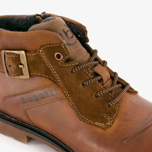 Cognac bruine veterboots voor heren van Bugatti. Het buiten- en binnenwerk zijn gemaakt van leer en de stevige profielzool van rubber. Voorzien van een veter- en ritssluiting en van een siergesp aan de buitenzijde. Deze nette hebben een comfortabele binnenzool van textiel en een laag hakje. Binnenzool is niet uitneembaar.