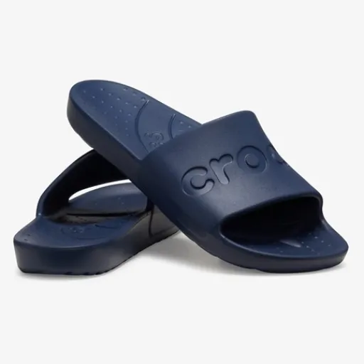 Donkerblauwe Crocs Slide heren badslippers. Voorzien van een Crocs-logo op het gestroomlijnde bovenzijde en volledig gevormd uit Croslite™ voor een lichte en comfortabele feel. De slippers hebben een comfortabele pasvorm. Het Croslite™-materiaal zorgt voor het kenmerkende Crocs comfort.