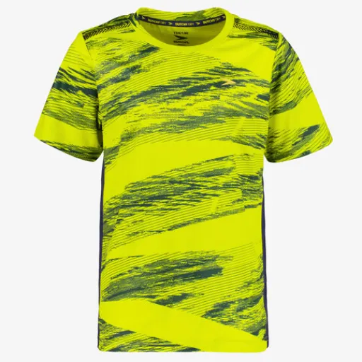 Geel-zwart Dutchy Dry voetbal T-shirt voor kinderen. Voorzien van een ronde hals, korte mouwen, een zwarte all over print en een merkopdruk op de borst. Het shirt is vervaardigd van sneldrogend materiaal en heeft een fijne pasvorm. Zo kan jij je vrij bewegen tijdens het trainen en blijf je droog. Dutchy Dry artikelen zijn lichtgewicht, zweetafvoerend, vochtregulerend en duurzaam. Gemaakt van 100% polyester.