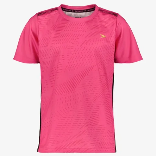 Roze Dutchy Dry voetbal T-shirt voor kinderen. Voorzien van een ronde hals, korte mouwen en een grafische all over print. Het shirt heeft mesh stroken langs de zijkanten die voor ventilatie zorgen. Dutchy Dry artikelen zijn lichtgewicht, zweetafvoerend, vochtregulerend en duurzaam. Gemaakt van 100% polyester.