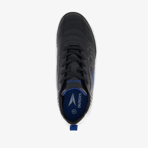Zwart-witte zaalvoetbalschoenen voor kinderen van Dutchy. Het buitenwerk is gemaakt van imitatieleer, het binnenwerk van textiel en de non-marking profielzool is van rubber. Voorzien van een vetersluiting en uitneembare binnenzool van textiel. De zaalschoenen hebben blauwe accenten en merkopdrukken op het bovenwerk.