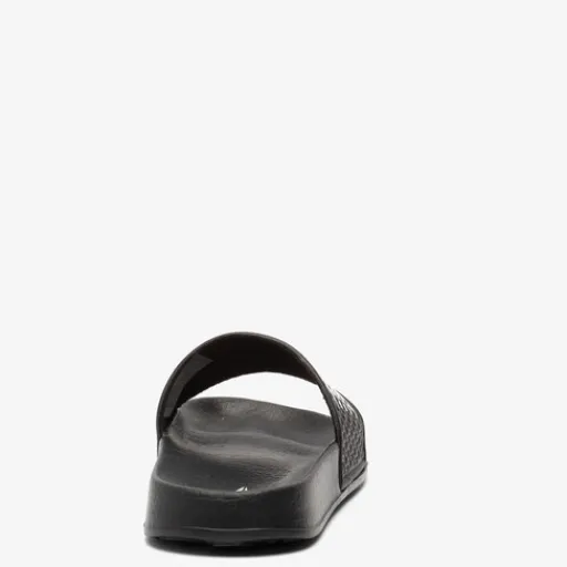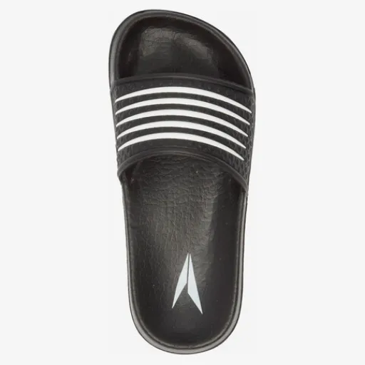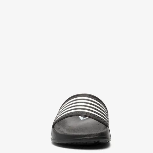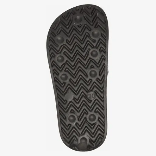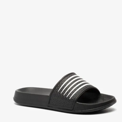 Zwarte badslippers voor kids van Dutchy. De badslippers zijn gemaakt van sneldrogend, synthetisch materiaal en hebben een rubberen profielzool. Voorzien van een comfortabel voetbed en een brede voetband met witte accenten. Dankzij het lichtgewicht materiaal dat snel droogt zijn de badslippers ideaal om mee te nemen op vakantie, naar het zwembad, de sauna of gewoon voor binnenshuis.