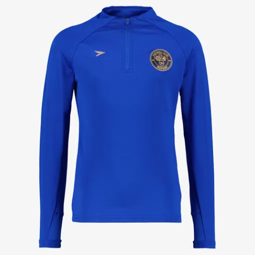 Blauwe voetbal pully voor kinderen van Dutchy. Voorzien van een kraagje met een korte rits en lange mouwen. De pully heeft een ronde embleem op de arm en een logo opdruk op de borst. Gemaakt van 91% polyester en 9% elastaan.