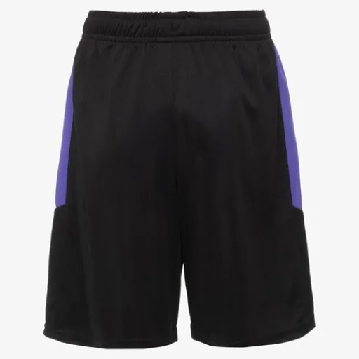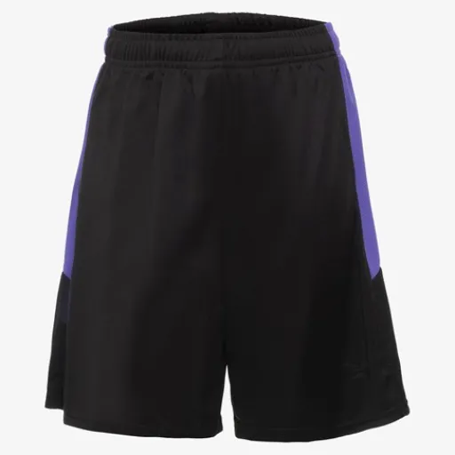 Zwarte voetbalshort voor kinderen van Dutchy. Voorzien van een elastische tailleband met aantrekkoordjes en paarse accenten. Het voetbalbroekje is gemaakt van sneldrogend materiaal en heeft een comfortabele pasvorm. Gemaakt van 100% gerecycled polyester.