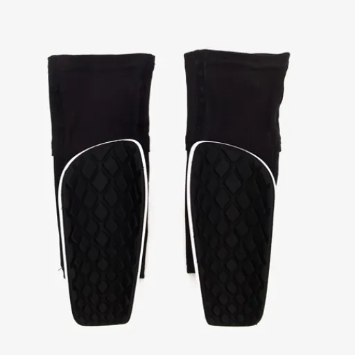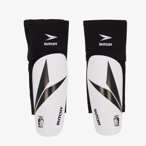 Wit/zwarte scheenbeschermers van Dutchy. De scheenbeschermers zijn anatomisch gevormd en blijven dankzij de enkelsokken extra goed zitten. De EVA-voering dempt schokken, waardoor je niet meer bang hoeft te zijn voor schoppen tijdens je wedstrijd. Maatvoering: XS = 155 CM.