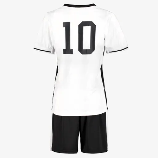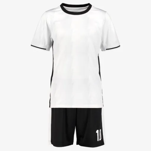 Wit-zwarte sport set voor kinderen met rugnummer 10! Het setje bestaat uit een wit shirt met mesh inzetten onder de oksels en langs de zijkanten. Deze bieden extra ventilatie en comfort. Het broekje is zwart en heeft een elastische tailleband met aantrekkoordjes. Het setje is ideaal voor voetbaltraining en gymles. Gemaakt van 100% polyester.