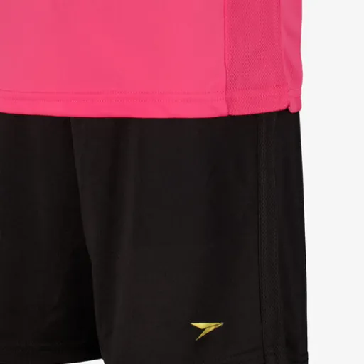 Deze tweedelige sport set voor meisjes van Dutchy is ideaal voor voetbaltraining of gymles! Het setje bestaat uit een roze shirt met mesh inzetten onder de oksels en langs de zijkanten. Deze bieden extra ventilatie en comfort. Het broekje is zwart en heeft een elastische tailleband met aantrekkoordjes. Dit artikel is gemaakt van 100% GRS gecertificeerd gerecycled polyamide (TE-303856).