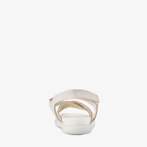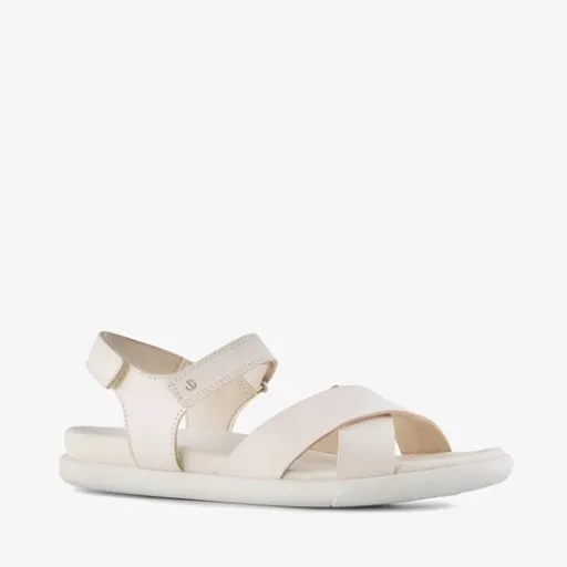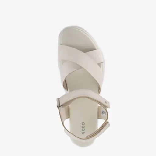 Beige ECCO Damara sandalen voor dames. Het boven- en binnenwerk zijn gemaakt van leer, het vaste voetbed is van textiel en de stevige profielzool is van rubber. Deze comfortabele sandalen hebben cross-over bandjes bij de tenen en klittenbandsluitingen bij de enkel en hiel.