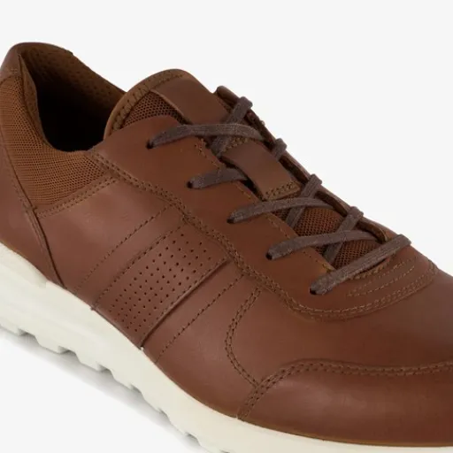 Bruine ECCO sneakers voor heren. Het buiten- en binnenwerk zijn gemaakt van leer en de stevige zool met profiel is van rubber. Voorzien van een vetersluiting en een uitneembare binnenzool van textiel. Deze comfortabele heren sneakers hebben een witte buitenzool en helemaal gevoerd.