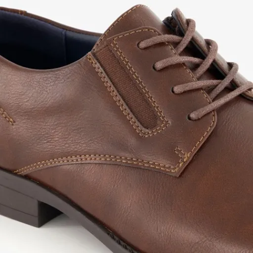 Bruine veterschoenen voor heren uit de Emilio Salvatini collectie. Het buiten- en binnenwerk zijn gemaakt van imitatieleer en de buitenzool is van rubber. Deze nette herenschoenen zijn voorzien van een vetersluiting en een vast voetbed van imitatieleer.