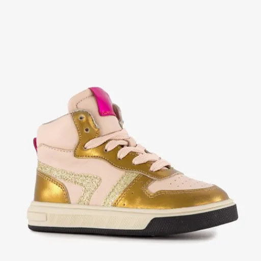 Hoge, roze meisjes sneakers met gouden details en glitters. Het buiten- en binnenwerk zijn gemaakt van leer en de stevige zool van rubber. Voorzien van een veter- en ritssluiting met klittenband voor een optimale pasvorm en hiellusjes voor een makkelijke instap. Deze mooie meisjes sneakers hebben een zwarte buitenzool met profiel en een uitneembare binnenzool van leer. Zo kan jij eventueel jouw eigen zolen in de schoenen dragen.